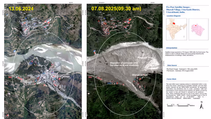 உத்தரகாசியில் ஏற்பட்ட திடீர் வெள்ளம் கட்டிடங்களை அழித்து, நதியின் பாதைகளை மாற்றியமைத்துள்ளது. இஸ்ரோவின் செயற்கைக்கோள் படங்கள், வெள்ளத்தால் ஏற்பட்ட அழிவின் அளவை வெளிப்படுத்துகின்றன.