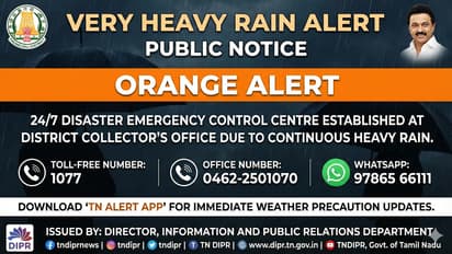 திருநெல்வேலி மாவட்டத்தில் தொடர்ச்சியாகப் பெய்து வரும் கனமழை காரணமாக, மாவட்ட நிர்வாகம் பொதுமக்களுக்கு 'ஆரஞ்சு அலர்ட்' (Orange Alert) விடுத்துள்ளது. மிகக் கனமழை பெய்யும் வாய்ப்பு உள்ளதால், பொதுமக்கள் எச்சரிக்கையுடனும் பாதுகாப்பாகவும் இருக்குமாறு மாவட்ட நிர்வாகம் அறிவுறுத்தியுள்ளது.