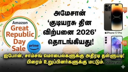 Amazon அமேசான் பிரைம் உறுப்பினர்களுக்கான 'கிரேட் ரிபப்ளிக் டே சேல் 2026' விற்பனை தொடங்கியது. iPhone 17 Pro, iPhone 15, Samsung Galaxy A55 மற்றும் OnePlus மொபைல்களுக்கான விலை குறைப்பு விவரங்களை இங்கே காணுங்கள்.