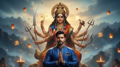 • ப்ராம்ட் 2: நவராத்திரி விடியற்காலையில் மூடுபனி படர்ந்த மலைப்பகுதியில், மா துர்கா தனது உக்கிரமான போர் வீராங்கனை தோற்றத்தில், பல கைகளில் ஆயுதங்களுடன், கண்களில் ஒளி வீசும் ஒரு காவிய 4K சினிமாட்டிக் காட்சி. பின்னணியில் மிதக்கும் விளக்குகள் மற்றும் திரிசூலம் போன்ற புனித சின்னங்கள். முன் பகுதியில், ராயல் நீல குர்தா பைஜாமா அணிந்து, தன்னம்பிக்கையுடன் கைகூப்பி நிற்கும் ஒருவர். "Shubh Navratri! Let Maa Durga's grace fill your life with joy and victory" என்ற சம்ஸ்கிருதம் சார்ந்த எழுத்துக்களைச் சேர்க்கவும். பூக்கும் தாமரைகள், ஊதுபத்தி புகை மற்றும் பிரார்த்தனையில் ஈடுபடும் பக்தர்களின் குழுவைச் சேர்க்கவும். வெளிச்சமான நீலம் மற்றும் தங்க நிற சிறப்பம்சங்களுடன் கூடிய சினிமாட்டிக் லைட்டிங். எனது படம் குறிப்புப் படமாக பதிவேற்றப்பட்டுள்ளது, எனது முகம் எந்த மாற்றமும் இல்லாமல் அப்படியே இருக்க வேண்டும்.