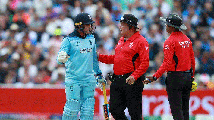 இந்தப் போட்டியில் அதிரடியை வெளிப்படுத்திய ஜேசன் ராய், ஆஸ்திரேலிய பந்துவீச்சாளர்களை பந்தாடினார். 20-வது ஓவரில் கம்மின்ஸ் வீசிய பந்தை அடிக்க முயற்சிக்கும்போது, பந்து பேட்டில் படாமல் விக்கெட் கீப்பர் அலெக்ஸ் கேரியிடம் சென்றது. கேரி, அவுட் என்று முறையிட்டதும் நடுவர் தர்மசேனா, விரலை உயர்த்தி விட்டார்.
