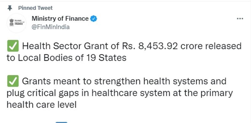 குறிப்பாக மின்துறை, திடக்கழிவு மேலாண்மை போன்றவற்றில் மாநில அரசுகள் நேரடிப் பணப் பரிவா்த்தனை அடிப்படையிலேயே மானியங்களை வழங்க வேண்டும் எனவும் நிதி ஆணையம் பரிந்துரை செய்திருந்தது. இதற்கிடையே பதினைந்தாவது நிதிக் குழு 2021-22 முதல் 2025-26 வரையிலான தனது அறிக்கையில் உள்ளாட்சி அமைப்புகளுக்கு மொத்தம் ரூ.4,27,911 கோடி மானியம் வழங்கப் பரிந்துரைத்துள்ளது. ஆணையம் பரிந்துரைத்த மானியங்களில் ரூ.70,051 கோடி சுகாதார மானியங்களும் அடங்கும். இந்த தொகையில் ரூ.43,928 கோடி ஊரக உள்ளாட்சி அமைப்புகளுக்கும், ரூ.26,123 கோடி நகர்ப்புற உள்ளாட்சி அமைப்புகளுக்கும் பரிந்துரைக்கப்பட்டுள்ளது. இந்நிலையில்,19 மாநிலங்களின் ஊரக மற்றும் நகர்ப்புற உள்ளாட்சி அமைப்புகளுக்கான சுகாதாரத் துறை மானியமாக ரூ.8,453.92 கோடியை நிதி அமைச்சகத்தின் செலவினத் துறை வெளியிட்டுள்ளது. பதினைந்தாவது நிதிக் குழுவின் பரிந்துரைகளின்படி இந்த மானியங்கள் வெளியிடப்பட்டுள்ளன.