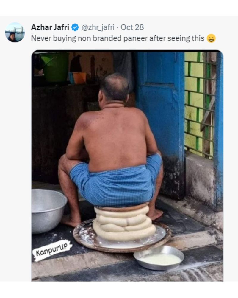 மூடப்படாத பன்னீர் குவியல்களின் மேல் லுங்கியில் அமர்ந்திருக்கும் ஒரு மனிதனின் படத்தை வெளியிட்டுள்ளார். "இதை பார்த்த பிறகு பிராண்டட் அல்லாத பனீர் வாங்க வேண்டாம்" என்று பயனர்கள் பதிவிட ஆரம்பித்தனர். இது போன்ற சம்பவங்கள் உள்ளூர் பால் கடைகளில் நடக்கிறதா என்ற கேள்வியை எழுப்பியது.