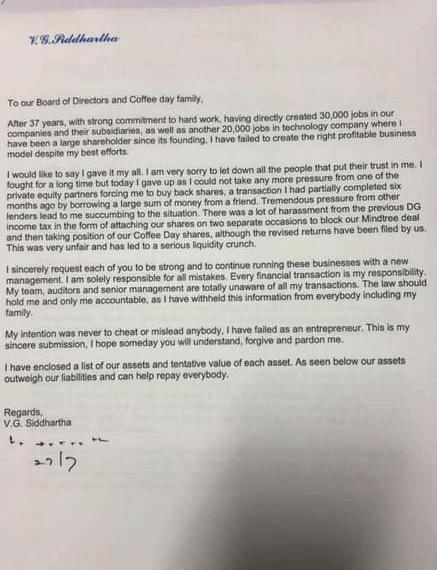 மேலும், சித்தார்த் எழுதியுள்ள அந்த கடிதத்தில், “37 வருடங்களுக்குப் பிறகு 30,000 நேரடி வேலை வாய்ப்புகளை உருவாக்கி, சிறந்த முறையில் இருந்தபோதிலும், என்னால் சரியான லாபகரமான தொழிலாக எடுத்துச்செல்ல முடியவில்லை. என் மீது நம்பிக்கை வைத்திருந்த அனைவரையும் கைவிட்டதற்காக நான் மிகவும் வருந்துகிறேன். நான் நீண்ட காலமாக போராடினேன், ஆனால் இன்று என்னால் எந்த அழுத்தத்தையும் எடுத்துச்செல்ல முடியாததால் கைவிடுகிறேன்.