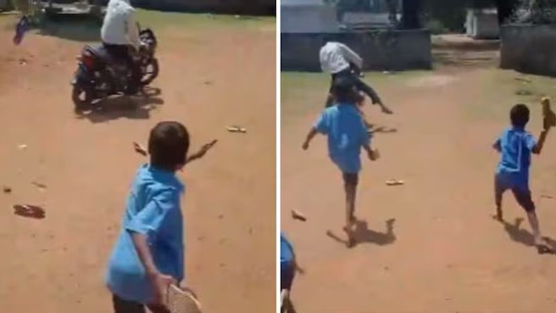 ஆனால், பள்ளி குழந்தைகளும் அவரைப் பின்தொடர்ந்து செருப்புகளை வீசி விரட்டியடித்தனர். இதுதொடர்பான வீடியோ காட்சிகள் தற்போது சமூக வலைதளத்தில் வெளியாகி வைரலாகி வருகிறது.