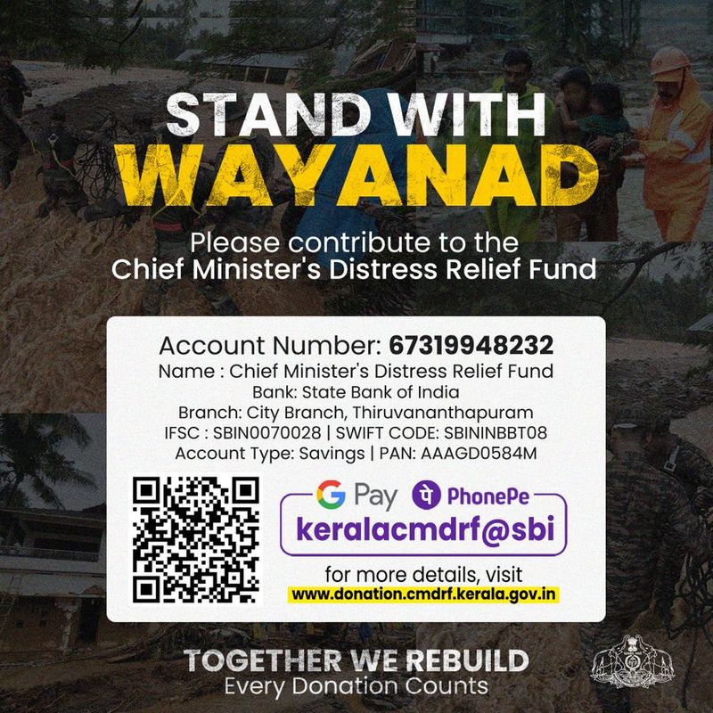 இதனிடைய மிகப்பெரிய இழப்பை சந்தித்துள்ள கேரளா மாநில அரசுக்கு தன்னார்வலர்கள், திரை பிரபலங்கள், பிற மாநில அரசுகள் தங்களால் முடிந்த உதவிகளை செய்து வருகின்றன. இந்நிலையில், அம்மாநில முதல்வர் பினராயி விஜயன், பொதுமக்கள் நிதியுதவி அளிக்குமாறு கோரிக்கை விடுத்துள்ளார். இது தொடர்பாக அவர் வெளியிட்டுள்ள எக்ஸ் தள பதிவில், “சோக காலங்களில், அனைவரும் கை கோர்ப்பது ஒற்றுமையின் தூய்மையான வடிவம், யாரும் துன்பங்களைத் தனியாக எதிர்கொள்ள மாட்டார்கள். ஒவ்வொரு பங்களிப்பும் முக்கியமானது, அதன் அளவு வித்தியாசப்பட்டாலும் நிச்சயம் முன்னேற்றம் ஏற்படும்” என்று குறிப்பிட்டு வங்கி விவரங்களை வெளியிட்டுள்ளார்.