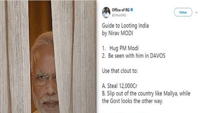 மேலும், இந்தியாவை சூறையாடுவதற்கான வழி, பிரதமர் நரேந்திர மோடி கட்டி அணைப்பது மற்றும் அவருடன் டாவோஸ் மாநாட்டில் பங்கேற்பது, அந்த செல்வாக்கை வைத்து 12000 கோடி ரூபாய் திருடி, அரசு கண்டுகொள்ளாமல் இருக்கும்போது மல்லையாவைப் போல நாட்டை விட்டே தப்பி விடுவது ஆகியன என்று காங்கிரஸ் கட்சியின் தலைவர் ராகுல் காந்தி ட்விட்டரில் பதிவிட்டுள்ளார்.
