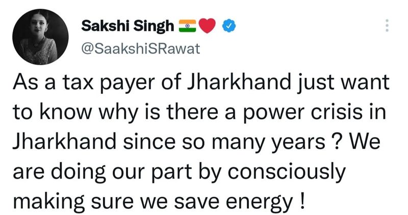 இந்தநிலையில் ஜார்கண்ட் மாநிலத்தில் மின் வெட்டு தொடர்ந்து ஏற்பட்டு வரும் நிலையில் இந்திய அணியின் முன்னாள் கேப்டனும், சென்னை சூப்பர் கிங்ஸ் வீரருமான தோனியின் மனைவி சாக்ஷி டுவிட்டரில் கொதித்தெளுந்துள்ளார். அதில் அரசுக்கு வரி செலுத்துபவர் என்ற முறையில், ஜார்க்கண்ட் மாநிலத்தில் பல ஆண்டுகளாக மின் நெருக்கடி ஏன் உள்ளது என்பதை அறிய விரும்புவதாகக் கேள்வி எழுப்பியுள்ளார். ஆற்றலைச் சேமிப்பதை உறுதி செய்வதன் மூலம் தங்களின் பங்கைச் சரியாக செய்து வருவதாகவும் சாக்ஷி அந்த டுவிட்டர் பதிவில் குறிப்பிட்டுள்ளார். சாக்ஷியின் டுவிட்டர் பதிவு சமூக வலைதளத்தில் பரவலாக பகிரப்பட்டு வருகிறது.