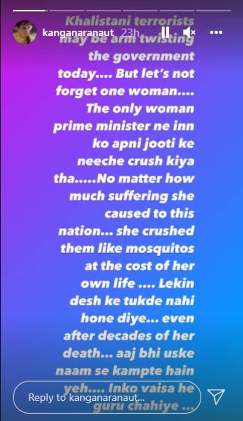 மேலும் இதுக்குறித்து தனது இன்ஸ்டாகிராம் பக்கத்தில், காலிஸ்தானி பயங்கரவாதிகள் அரசை தங்களுக்கு ஏற்றப்படி வளைக்கலாம். ஆனால் நாட்டின் ஒரே ஒரு பெண் பிரதமர் (இந்திரா) அவர்களைத் தனது ஷூவில் போட்டு நசுக்கினார். அவர் (இந்திரா) இந்த தேசத்திற்கு எவ்வளவு துன்பம் கொடுத்திருந்தாலும் கொசுக்களைப் போல் தன் உயிரைப் பணயம் வைத்து அவர்களை (காலிஸ்தானி பயங்கரவாதிகளை) நசுக்கினார். அவர் உயிரிழந்து பல ஆண்டுகள் ஆன பிறகும் கூட இன்றும் அவரது (இந்திரா) பெயரைக் கேட்டால் அவர்கள் நடுங்குகிறார்கள். அவரை போன்ற ஒரு நபர் தான் இப்போது தேவை" எனப் பதிவிட்டிருந்தார். இந்தச் சர்ச்சைக் கருத்துக்கு எதிராக கங்கனா ரனாவத் மீது டெல்லி மந்திர் மார்க் காவல் நிலையத்தின் சைபர் க்ரைம் பிரிவில் புகார் அளிக்கப்பட்டுள்ளதாக தெரிவிக்கப்பட்டிருந்தது. நடிகை கங்கனா ரனாவத்தின் இந்தச் சர்ச்சை பதிவுக்கு குருத்வாரா அமைப்பும் கடும் கண்டனத்தைத் தெரிவித்துள்ளது. கங்கனா ரனாவத் சீக்கியர்களை இழிவான மற்றும் அவமதிக்கும் வார்த்தைகளால் விமர்சித்துள்ளதாகவும் சாடியுள்ளனர்.