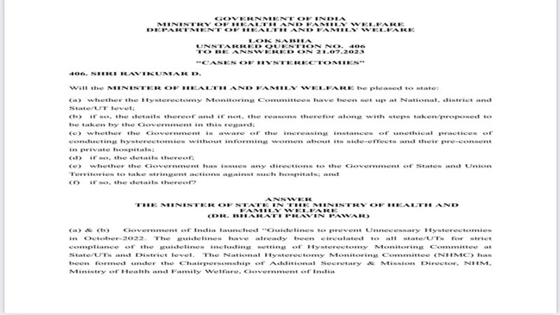 நாடாளுமன்ற மழைக்காலக் கூட்டத்தொடர் நடைபெற்று வருகிறது. அதில், “கருப்பை அகற்றுதல் கண்காணிப்புக் குழுக்கள் தேசிய, மாநில மற்றும் மாவட்ட அளவில் அமைக்கப்பட்டுள்ளனவா? அப்படியானால், அதன் விவரங்கள் மற்றும் இல்லையெனில், அதற்கான காரணங்கள் மற்றும் அரசு இது தொடர்பாக எடுக்க வேண்டிய நடவடிக்கைகள் அதற்கான முன்மொழிவுகள் என்ன ?” என்று விழுப்புரம் எம்.பி ரவிக்குமார் கேள்வி எழுப்பியிருந்தார்.