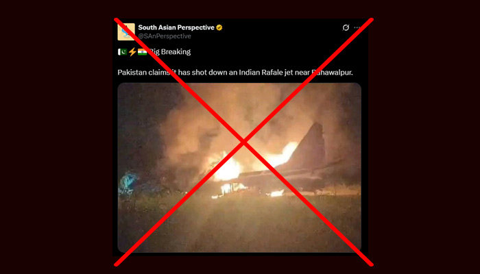 'பஹல்வால்பூர் அருகே இந்திய ராஃபேல் விமானம் வீழ்த்தப்பட்டது' என்ற தலைப்பில் எக்ஸ் தளத்தில் புகைப்படம்/காணொளி பகிரப்பட்டது.