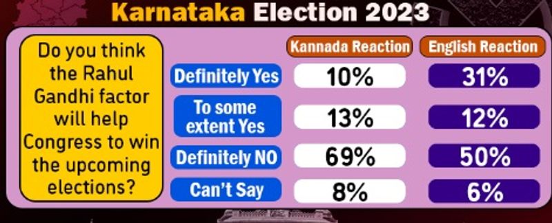 கன்னடத்தில் 69 சதவீதம் பேர், ஆங்கிலத்தில் 50 சதவீதம் பேர் கர்நாடகாவில் காங்கிரஸ் வெற்றிக்கு ஒரு காரணியாக ராகுல் காந்தி இருக்கமாட்டார் என்று தெரிவித்துள்ளனர்.