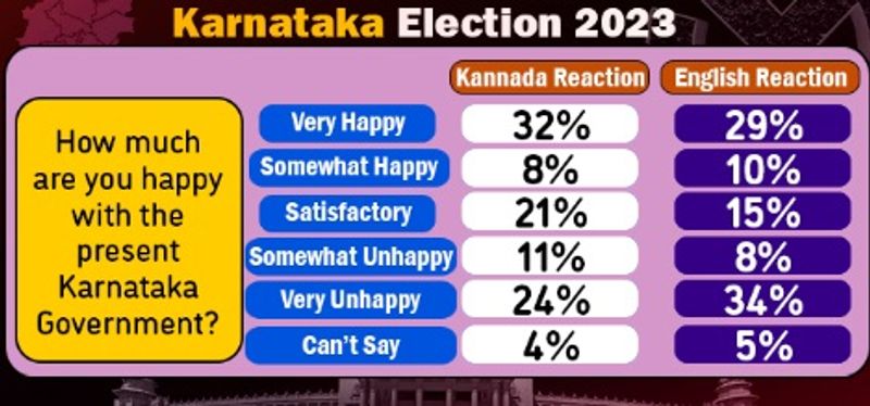 கன்னட இணையத்தில் பதில் அளித்தவர்களில் 35 சதவீதம் பேர் மாநிலத்தில் தற்போது ஆட்சியில் உள்ள பாஜக அரசாங்கத்தால் ஏதோ ஒரு வகையில் அதிருப்தி அடைந்துள்ளனர். அதேசமயம் 52 சதவீத மக்கள் இரட்டை இஞ்சின் ஆட்சியில் திருப்தி என்று தெரிவித்துள்ளனர்.
