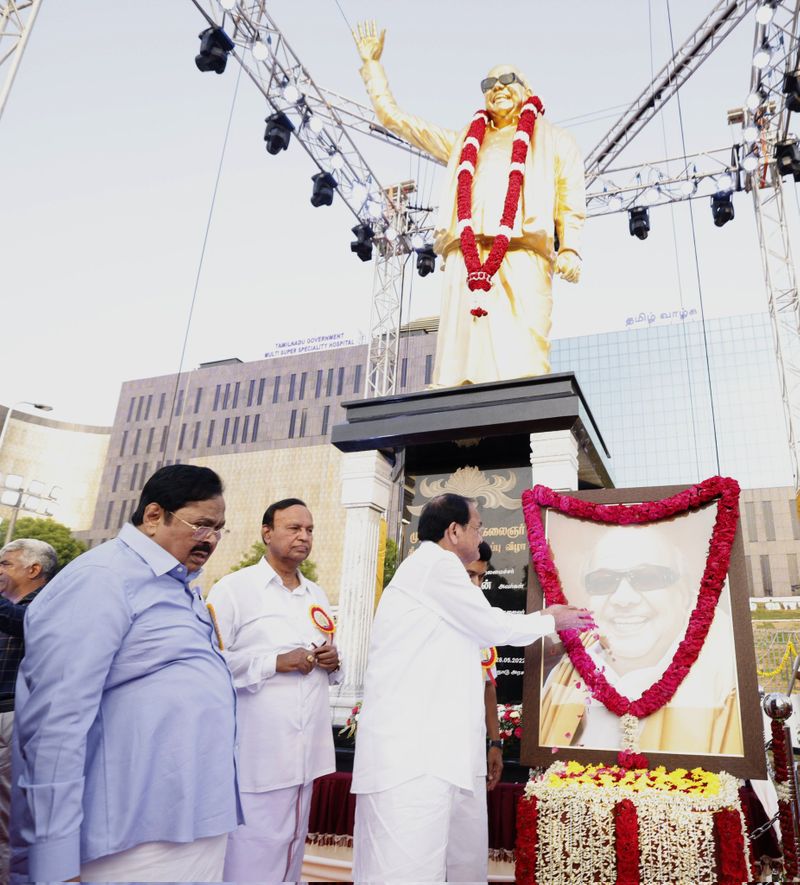 சென்னை ஓமந்தூரார் அரசினர் தோட்ட வளாகத்தில் 12 அடி உயர பீடத்தில், 16 அடி உயரத்தில் ரூ.1.7 கோடி மதிப்பில் நிறுவப்பட்டுள்ள மறைந்த முன்னாள் முதலமைச்சர் கருணாநிதியின் முழு உருவ வெண்கலச் சிலையை குடியரசு துணைத் தலைவர் வெங்கையா நாயுடு இன்று திறந்து வைத்தார்.