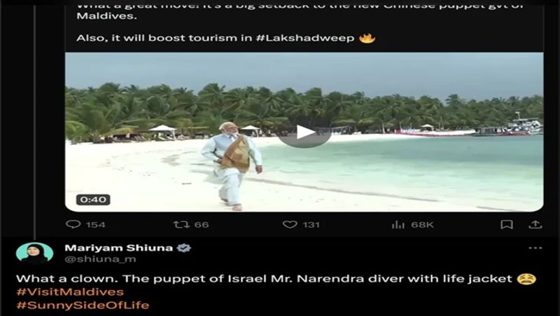 அதுபோன்று, எக்ஸ் பயனர் ஒருவர் பதிவுக்கு கருத்து தெரிவித்த மாலத்தீவு இளைஞர் அதிகாரமளித்தல், தகவல் மற்றும் கலைத்துறை இணை அமைச்சர் மரியம் ஷியுனா, பிரதமர் மோடியை ‘கோமாளி’ என்றும், ‘இஸ்ரேலின் கைப்பாவை’ என்றும் குறிப்பிட்டு, அவமதிக்கும் வகையில் கருத்துகளை வெளியிட்டார்.