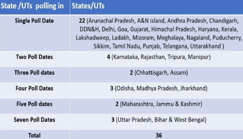 ஏழு கட்டமாக நடக்க உள்ள மக்களவைத் தேர்தலில் முதல் கட்டத்தில் தமிழகம் உள்பட 21 மாநிலங்களில் ஏப்ரல் 19ஆம் தேதி தேர்தல் நடைபெறும், அதேபோல இரண்டாம் கட்டமாக 13 மாநிலங்களில் ஏப்ரல் 26 ஆம் தேதியும், மூன்றாம் கட்டமாக 12 மாநிலங்களில் மே 7ஆம் தேதியும், நான்காம் கட்டமாக 10 மாநிலங்களில் மே 13 ஆம் தேதியும், ஐந்தாம் கட்டமாக ஆறு மாநிலங்களில் 20ம் தேதியும், ஆறாம் கட்டமாக 7 மாநிலங்களில் மே 25ஆம் தேதியும், ஏழாம் கட்டமாக ஆறு மாநிலங்களில் ஜூன் 1ம் தேதியும் தேர்தல் நடைபெற உள்ளது.