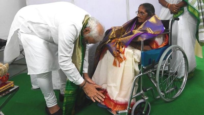 பிரதமர் நரேந்திர மோடி இன்று ஆந்திர மாநிலம் பீமாவரத்தில் நடைபெற்ற ஒரு நிகழ்ச்சியில் கலந்துகொண்டார். பின்னர் ஆந்திராவின் சிறந்த சுதந்திரப் போராட்ட வீரர் பசாலா கிருஷ்ண மூர்த்தியின் மகள் 90 வயதான பசல கிருஷ்ண பாரதியின் முன் வணங்கி ஆசி பெற்றார். பிரதமர் நரேந்திர மோடியின் இந்த புகைப்படம் சமூக வலைதளங்களில் வைரலாகி வருகிறது.