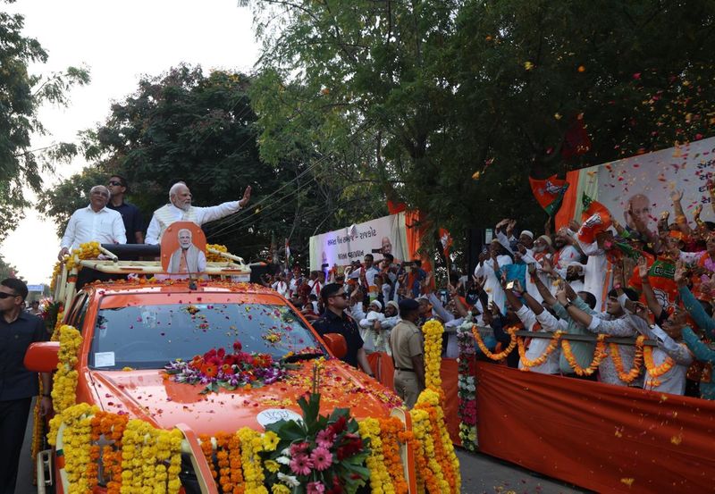 சாலையின் இருபுறமும் நின்றிருந்த ஆயிரக்கணக்கான மக்கள் பிரதமர் மீது மலர் தூவி வரவேற்றனர். கூட்டத்தில் இருந்த இஸ்லாமிய சமுதாய மக்களும் ஆர்வத்துடன் பிரதமர் மோடியை மலர்தூவி வரவேற்றனர். மக்களின் உற்சாகத்தைக் கண்டு பிரதமர் மோடி மிகவும் மகிழ்ச்சியடைந்தார். பின்னர் கூட்டத்தைப் பார்த்து கையை அசைத்துக்கொண்டே சென்றார். அப்போது மக்கள் பாரத் மாதா கி ஜெய்... மோடி... மோடி... என்ற முழக்கங்களை எழுப்பினர். முன்னதாக பிரதமர் மோடி ராஜ்கோட்டில் சுமார் 5860 கோடி ரூபாய் மதிப்பிலான திட்டங்களுக்கு அடிக்கல் நாட்டினார்.