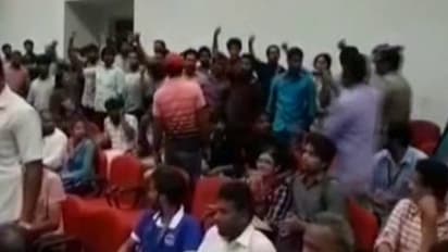 விழாவின் தொடக்கம் வரை அமைதி காத்த மாணவர்கள், தருண் விஜய் மைக் பிடித்ததும், எதிர்ப்பு தெரிவித்து திடீரென முழக்கமிடத் தொடங்கினர். பதற்றம் அடைந்த காவலர்கள் மாணவர்களை அமைதி காக்கும்படி அறிவுறுத்தினர். "தருண் விஜயே வெளியேறு".. "தருண்விஜயே வெளியேறு".. என்று அரங்கமே அதிரும் வகையில் மாணவர்கள் தொடர்ந்து முழக்கமிட்டனர்.