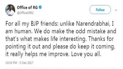 என்னுடைய அனைத்து பா.ஜனதா நண்பர்களுக்கும் நான் சொல்வது என்னவென்றால், நான் மோடி சகோதரரைப் போல் அல்ல. நான் சாதாரண மனிதன்தான். அதனால்தான் தவறுகள் செய்வதும், நடைபெறுவதும் இயல்பாகிறது. அந்த தவறுகள்தான் வாழ்க்கை சுவாரஸ்யமாக்குகிறது. என்னுடைய தவறை சுட்டிக்காட்டிய உங்களுக்கு நன்றி. தொடர்ந்து என்னுடைய தவறுகளை சுட்டுக்காட்டினால், என்னை நான் முன்னேற்றிக்கொள்ள உதவும். பா.ஜனதாவினர் அனைவரையும் விரும்புகிறேன்’’ என டுவிட்டரில் தெரிவித்துள்ளார்.