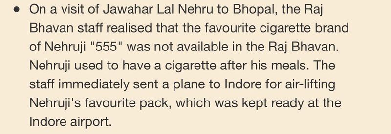 இதையடுத்து ராஜ் பவனில் தங்கவிருப்பதை அறிந்த ராஜ்பவன் ஊழியர்கள், நேருவுக்கு பிடித்தமான “555” பிராண்ட் சிகரெட் அங்கு இல்லாததை அறிந்திருந்தனர். சாப்பாடு சாப்பிட்ட பிறகு சிகரெட் பிடிக்கும் பழக்கும் நேருவுக்கு இருந்தது. 555 பிராண்ட் சிகரெட் ராஜ் பவனில் இல்லாததால், அதை வாங்க போபாலிலிருந்து இந்தூருக்கு தனி விமானம் சென்றதாக விநாயக் படாஸ்கர் தனது ராஜ் பவன் குறிப்பில் குறிப்பிட்டுள்ளார்.