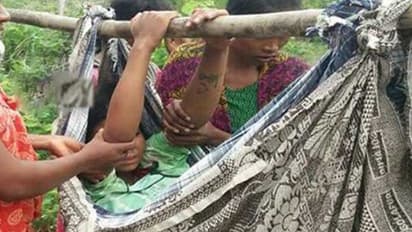 இதையடுத்து, கர்ப்பிணிப் பெண்ணை அவரது உறவினர்கள் சுமார் 6 கிலோ மீட்டருக்கு சுமந்து சென்றனர். குழந்தைக்கு தொட்டில் கட்டுவதுபோல், போர்வையால் மூங்கிலில் கட்டி கர்ப்பிணிப் பெண்ணை தோளில் சுமந்து சென்றனர்.