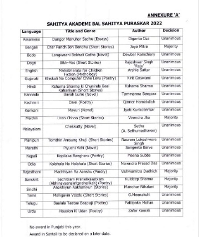 தமிழில் சிறுவர் இலக்கியத்துக்கான சாகித்ய அகாடமியின் பால சாகித்ய புரஸ்கார் விருது எழுத்தாளர் ஜி.மீனாட்சிக்கு மல்லிகாவின் வீடு எனும் சிறுவர் சிறுகதை தொகுப்புக்காக அறிவிக்கப்பட்டுள்ளது. இதேபோல் சாகித்ய அகாடமி வழங்கும் இளம் எழுத்தாளர்களுக்கான யுவ புரஸ்கார் விருதை தனித்திருக்கும் அரளிகளின் மதியம் எனும் தொகுப்புக்காக ப.காளிமுத்துக்கு அறிவிக்கப்பட்டுள்ளது.