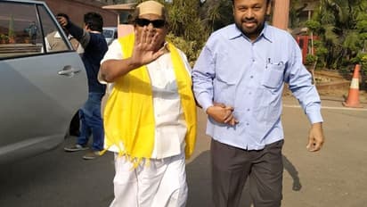 மறைந்த முன்னாள் முதல்வர் கருணாந்தி வேடமிட்டு தெலுங்குதேச எம்.பி சிவபிரசாத் நாடாளுமன்ற வளாகத்தின் முன் போராட்டத்தில் ஈடுபட்டார்.