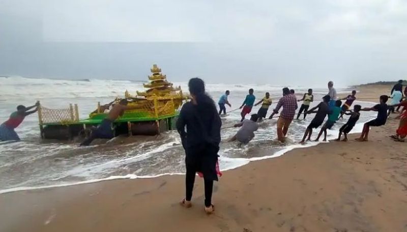கோயில் நிகழ்வுகளில் தேரை சாலைகளில் மக்கள் வடம் பிடித்து வருவது சம்பிரதாயமாக இருந்து வருகிறது. ஆனால் கடலில் மிதந்து வந்த தேரை பொதுமக்கள் கயிறு கட்டி இழுத்த சம்பவம் பரபரப்பை ஏற்படுத்தியுள்ளது. ஆந்திர மாநிலம் ஶ்ரீகாகுளம் பகுதியில் சன்னப்பள்ளி கடற்கரைப்பகுதியில் தங்க நிறத்திலான தேர் மிதந்து வந்துள்ளது. இதனை பார்த்த கடற்கரையில் உள்ள மக்கள் அதிர்ச்சி அடைந்தனர். கோயில்களில் உள்ள தேர் எப்படி கடலில் மிதந்து வருகிறது எனஆச்சர்யம் அடைந்தனர். இதனையடுத்து அந்த பகுதியில் உள்ள மக்கள் ஒன்றிணைந்து தேரை கயிற்றால் கட்டி கரையோரத்திற்கு கொண்டு வந்தனர். அருகில் தேர் வந்ததும் தான் தெரிந்தது இது பெரிய அளவிலான உண்மையான தேர் இல்லையென்பது. இருந்தபோதும் இந்த தேர் மிகவும் அழகாக வடிவமைக்கப்பட்டுள்ளதால் இந்த தேரை பார்க்க அருகில் உள்ள கிராமத்தை சேர்ந்த ஏராளமான பொதுமக்கள் கூடியதால் பரபரப்பு ஏற்பட்டது.