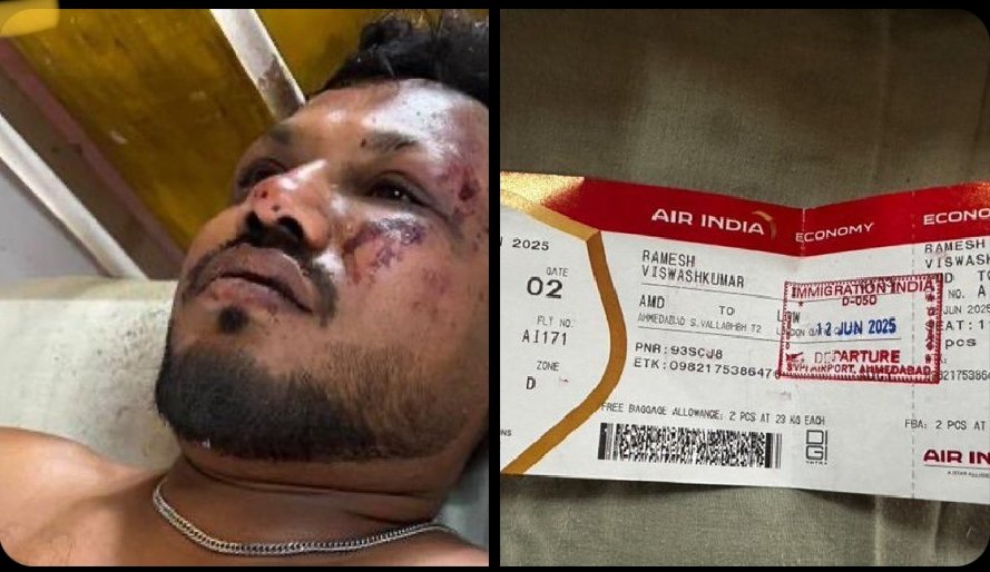 ரமேஷ் விஸ்வாஸ் குமார் என்ற அந்த இளைஞர் அவசரகால வெளியேறும் வழியாக வெளியில் குதித்துள்ளார். இதன் காரணமாக அவருக்கு மார்பு, கண், கால் உள்ளிட்ட இடங்களில் காயம் ஏற்பட்டுள்ளது. தற்போது மருத்துவமனையில் அனுமதிக்கப்பட்டுள்ள அவர், சிகிச்சைப் பெற்று வருகிறார். விமானத்திலிருந்து கீழே குதித்த அவர் ரத்த காயங்களுடன் ஆம்புலன்ஸில் ஏறும் காட்சிகள் இணையத்தில் வைரலாகி வருகிறது. தற்போது அவருக்கு தீவிர சிகிச்சை அளிக்கப்பட்டு வருவதாகவும் கூறப்படுகிறது.