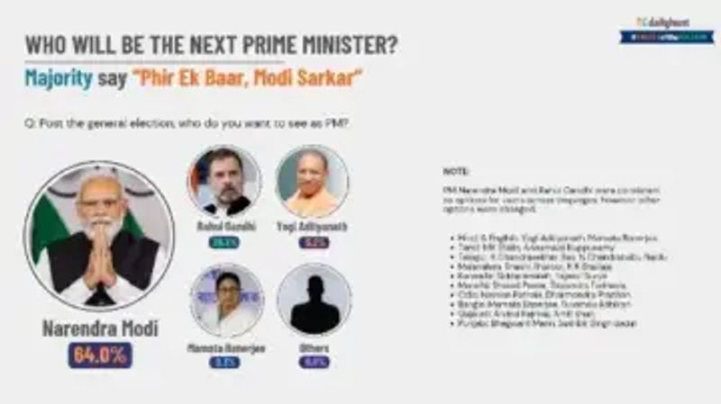 பதிலளித்தவர்களில் கணிசமான 64% பேர் நரேந்திர மோடி பிரதமராகத் தொடர விரும்புகின்றனர். இது பிரதமர் மோடியின் பரந்த மக்கள்தொகை முறையீட்டைக் காட்டுகிறது, இளம் வாக்காளர்கள் முதல் ஓய்வு பெற்ற நபர்கள் வரை, தேசியத் தலைவராக அவரது வலிமையை அடிக்கோடிட்டுக் காட்டுகின்றனர் என்றே கூறலாம்.