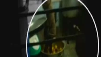 ரயில்வே ஊழியர் ஒருவர்,உணவு தயாரிக்கும் பெட்டியில் உருளை கிழங்கை தன் காலில் மிதித்து, அதனை பொடியாக்குகிறார்.