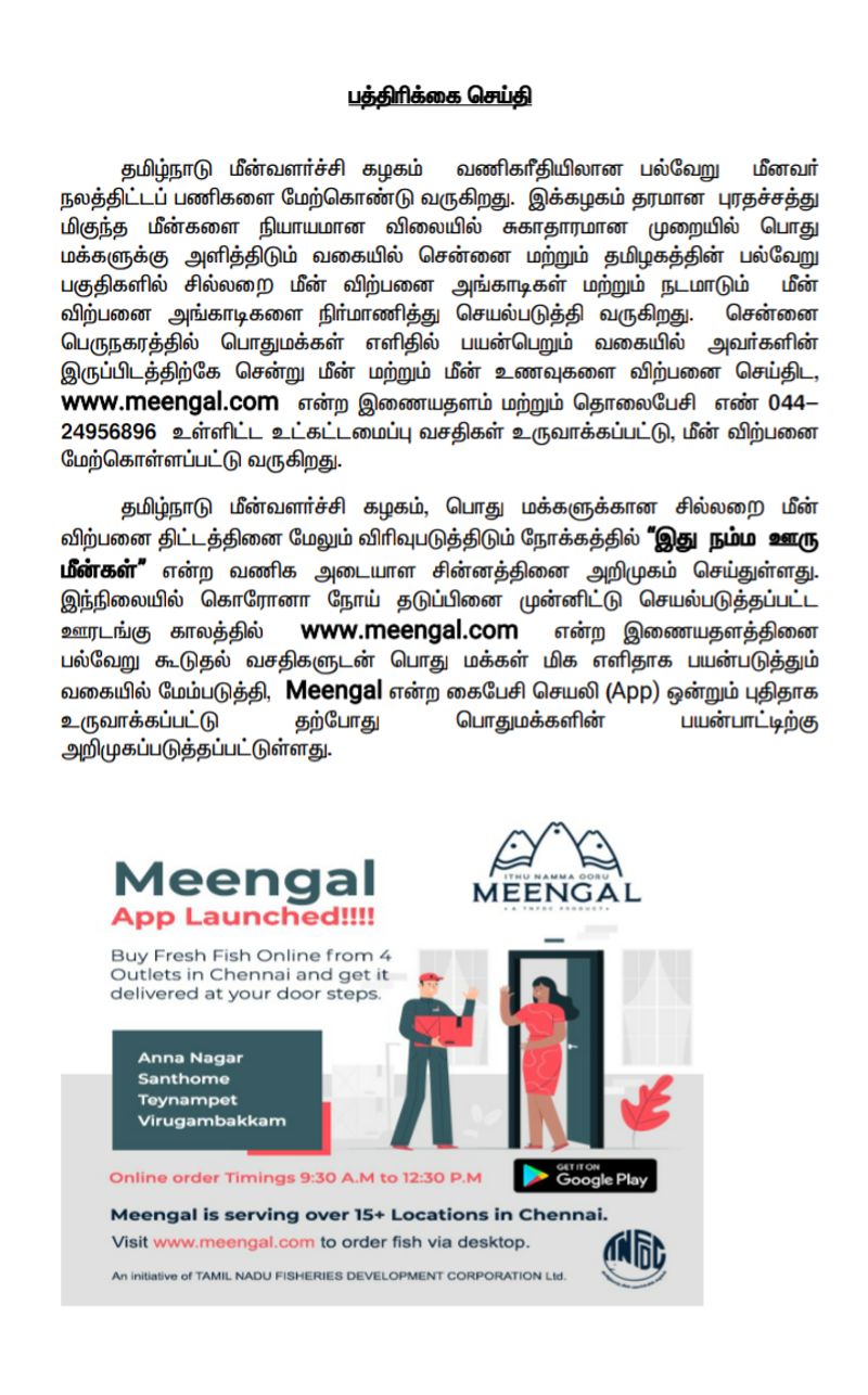 "தமிழ்நாடு மீன் வளர்ச்சி கழகம் பொதுமக்களுக்கான சில்லரை விற்பனை திட்டத்தை மேலும் விரிவுபடுத்தும் நோக்கத்தில் "இது நம்ம ஊரு மீன்கள்" என்ற வணிக அடையாளத்தினை அறிமுகம் செய்துள்ளது. இந்த நிலையில் meengal என்ற கைபேசி செயலி உருவாக்கப்பட்டு, பொதுமக்கள் பயன்பாட்டிற்கு அறிமுகப்படுத்தப்பட்டு உள்ளது. ஊரடங்கு உத்தரவு இருக்கக்கூடிய இந்த காலகட்டத்தில் மக்கள் அனைவரும் பயன் பெறும் வகையில் இந்த செயலி உருவாக்கப்பட்டுள்ளது.