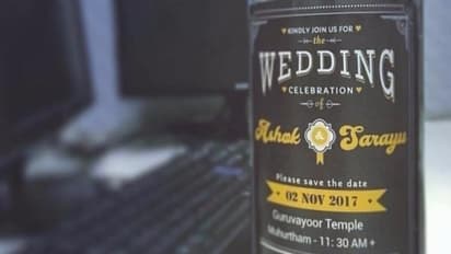 பொதுவாக மது பாட்டிலின் மேலே ஸ்டிக்கர் ஒட்டப்பட்டு இருப்பது போல் இதில் மதுபாட்டில் போட்டோவில், ஸ்டிக்கர் இருக்கும் பகுதியில் திருமணம் குறித்த விவரங்கள் இடம்பெற்றுள்ளன. ‘வெட்டிங்’ என்று ஸ்டைலிஷாக கொட்டை எழுத்தில் எழுதப்பட்டிருக்கிறது வரும் நவம்பர் 2-ம் தேதி நடைபெறவிருக்கும் திருமணத்துக்கான அழைப்பிதழ் அது. மணமகன் பெயர் ‘அசோக்’, மணமகள் பெயர் ‘சரயு’வாம்.