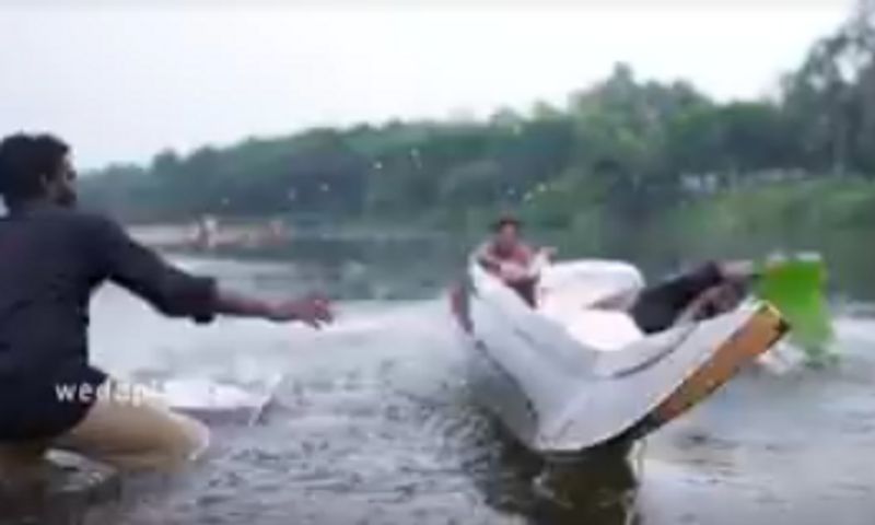 அப்போது எதிர்பாராத விதமாக தோனி சற்று நிலைதடுமாறி உள்ளது. அதில் மணமக்கள் இருவரும் நிலை தடுமாறி ஆற்றில் விழுந்த இந்த காட்சியை சக தோணிகளில் அருகருகே பயணித்தவர்கள் தங்களது மொபைல் போனில் வீடியோவாக பதிவு செய்து சமூகவலைதளத்தில் பதிவிட்டுள்ளனர். தற்போது வைரலாக பரவி வருகின்றது என்பது குறிப்பிடத்தக்கது.