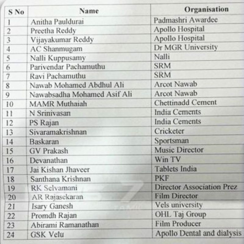 தொடர்ந்து இப்பட்டியலில், திரைப்பட தயாரிப்பாளர் அபிராமி ராமநாதன், முன்னாள் ஹாக்கி வீரர் பாஸ்கரன், தொழிலதிபர்கள் நல்லி குப்புசாமி, சீனிவாசன், பி.ஆர்.ராஜன், பிருந்தா ரெட்டி உள்ளிட்ட 24 முக்கிய பிரபலங்கள், திரைப்பிரபலங்கள் சந்தித்து பேசுகிறார்கள்.