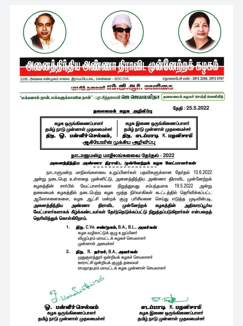 இதுக்குறித்து அதிமுக ஒருங்கிணைப்பாளர் ஓ.பன்னீர்செல்வம், இணை ஒருங்கிணைப்பாளர் எடப்பாடி பழனிசாமி ஆகியோர் கூட்டாக வெளியிடுள்ள அறிக்கையில், நாடாளுமன்ற மாநிலங்களவை தேர்தல் அனைத்திந்திய அண்ணா திராவிட முன்னேற்றக் கழக வேட்பாளர்கள் நாடாளுமன்ற மாநிலங்களவை உறுப்பினர்கள் பதவிகளுக்கான தேர்தல் 10.6.2022 அன்று நடைபெற உள்ளதை முன்னிட்டு, அனைத்திந்திய அண்ணா திராவிட முன்னேற்றக் கழகத்தின் சார்பில் வேட்பாளர்களை நிறுத்துவது சம்பந்தமாக 19.5.2022 அன்று தலைமைக் கழகத்தில் நடைபெற்ற கழக மூத்த நிர்வாகிகள் கூட்டத்தில் தெரிவிக்கப்பட்ட ஆலோசனைகளை, கழக ஆட்சி மன்றக் குழு பரிசீலனை செய்து எடுத்த முடிவின்படி, அனைத்திந்திய அண்ணா திராவிட முன்னேற்றக் கழகத்தின் அதிகாரப்பூர்வ வேட்பாளர்களாக முன்னாள் அமைச்சர் சி.வி.சண்முகம், முதுகுளத்தூர் ஒன்றியக் கழகச் செயலாளர் ஊராட்சி ஒன்றியக் குழுத் தலைவர் ம்ற்றும் ராமநாதபுரம் மாவட்டக் கழக முன்னாள் செயலாளர் தர்மர் ஆகியோர் தேர்ந்தெடுக்கப்பட்டு நிறுத்தப்படுகிறார்கள் என்பதைத் தெரிவித்துக் கொள்கிறோம் என்று தெரிவிக்கப்பட்டுள்ளது.