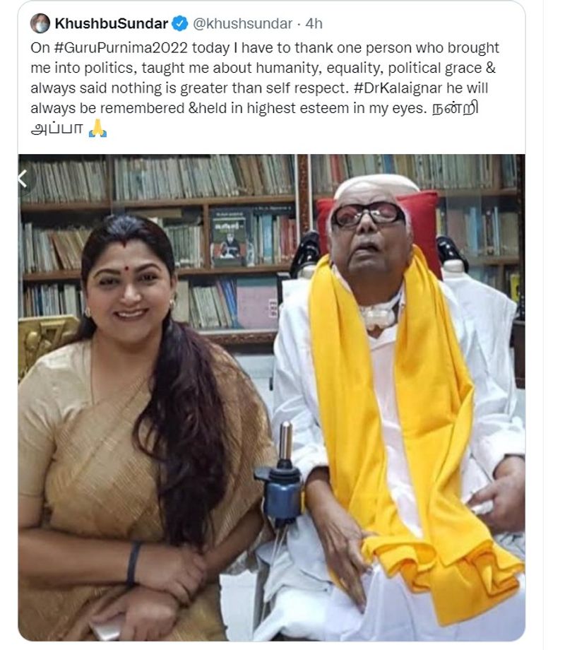சுமார் 6 வருடங்கள் காங்கிரஸ் கட்சியில் பணியாற்றிவர், 2020 ஆம் ஆண்டு பாரதிய ஜனதா கட்சியில் இணைத்துக்கொண்டார். இதனையடுத்து 2021 ஆம் ஆண்டு சட்டமன்ற தேர்தலில் ஆயிரம் விளக்கு தொகுதியில் போட்டியிட்டு தோல்வி அடைந்தார். தொடர்ந்து பாரதிய ஜனதா கட்சியில் தீவிரமாக பணியாற்றி வரும் குஷ்பு திமுகவை கடுமையாக விமர்சித்து வருகிறார். இந்தநிலையில் குரு பூர்ணிமாவையொட்டி டுவிட்டர் பதிவை ஒன்றை குஷ்பு வெளியிட்டுள்ளார். அதில் என்னை அரசியலுக்கு அழைத்து வந்து, மனிதாபிமானம், சமத்துவம், அரசியல் கருணை, சுயமரியாதையை விட சிறந்தது வேறு எதுவுமில்லை என்று சொல்லிக் கொடுத்த ஒருவருக்கு நன்றி சொல்ல வேண்டும் எனக்கூறியுள்ளவர், கருணாநிதிக்கு நன்றி தெரிவித்து அவருடன் எடுத்த புகைப்படத்தையும் பதிவிட்டுள்ளார். பாஜக தீவிரமாக திமுகவை விமர்சித்து வரும் நிலையில் பாஜக நிர்வாகியான குஷ்பு கருணாநிதியின் புகைப்படத்தை பதிவிட்டது நன்றி தெரிவித்தது பரபரப்பை ஏற்படுத்தியுள்ளது.