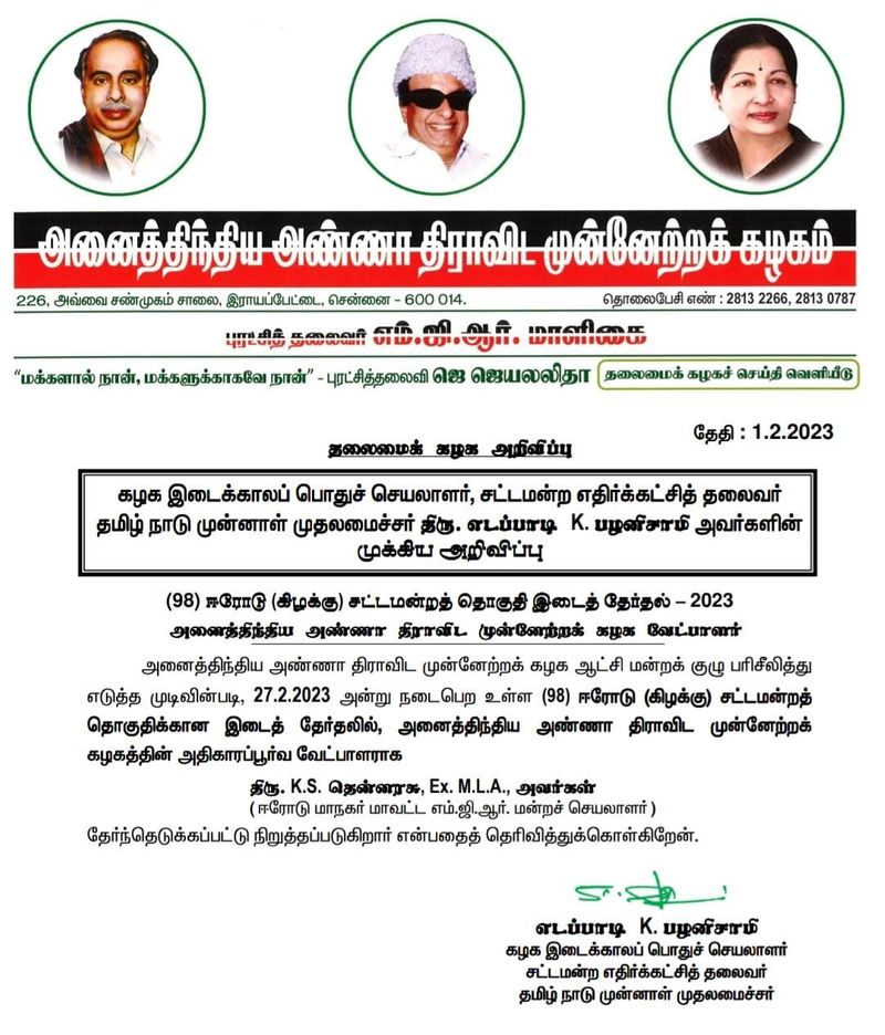 ஈரோடு கிழக்கு தொகுதி இடைத்தேர்தல் வருகிற 27ஆம் தேதி நடைபெறவுள்ளது. இந்த தேர்தலுக்கான வேட்புமனு தாக்கல் நேற்று தொடங்கியுள்ளது. திமுக கூட்டணி சார்பாக காங்கிரஸ் கட்சியின் மூத்த தலைவர் ஈவிகேஎஸ் இளங்கோவன் போட்டியிடுகிறார். நாம் தமிழர் கட்சி சார்பாக மேனகாவும், தேமுதிக சார்பாக ஆனந்தும், அம்மா மக்கள் முன்னேற்ற கழகம் சார்பாக சிவ பிரசாத்தும் வேட்பாளர்களாக அறிவிக்கப்பட்டுள்ளனர். இந்தநிலையில் அதிமுகவின் இபிஎஸ் அணி சார்பாக முன்னாள் எம்எல்ஏ தென்னரசு போட்டியிடுவார் எடப்பாடி பழனிசாமி அறிவித்துள்ளார்.