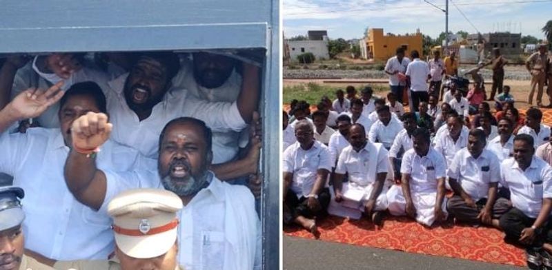 போராட்டத்தை கைவிடாததால் அதிமுக தொண்டர்கள் அனைவரையும் போலீசார் கைது செய்து பஸ்களில் ஏற்றினர். இதற்கு கண்டனம் தெரிவித்து அதிமுக தொண்டர்கள் கோஷங்கள் எழுப்பினர். தொடர்ந்து முன்னாள் அமைச்சர் ஆர்.பி உதயகுமாரை கைது செய்ய முற்பட்ட போது, தொண்டர்கள் போலீசாரிடம் வாக்குவாதத்தில் ஈடுபட்டு தள்ளுமுள்ளு நடைபெற்றது. இதனால் சுங்கச்சாவடி பகுதியில் பெரும் பரபரப்பு ஏற்பட்டது. போராட்டத்தில் ஈடுபட்ட அதிமுக தொண்டர்களை போலீசார் குண்டுகட்டாக தூக்கி பஸ்சில் ஏற்றினர். அனைவரையும் கைது செய்து தனியார் திருமண மண்டபத்தில் தங்க வைத்தனர்.
