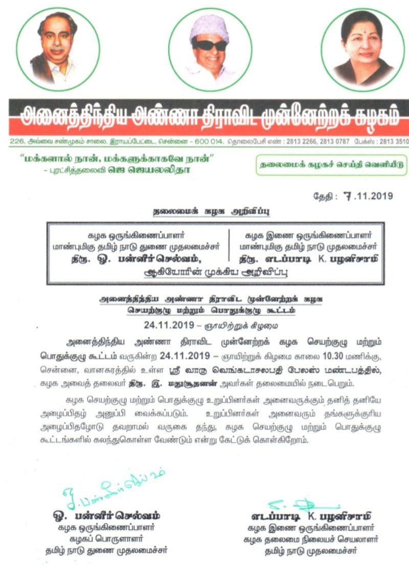அவைத்தலைவர் மதுசூதனன் தலைமையில் இந்தக் கூட்டம் நடைபெற உள்ளது. கழக செயற்குழு மற்றும் பொதுக்குழு உறுப்பினர்கள் அனைவருக்கும் தனித்தனியே அழைப்பிதழ் அனுப்பி வைக்கப்படும். உறுப்பினர்கள் அனைவரும் தங்களுக்குரிய அழைப்பிதழோடு தவறாமல் வருகை தந்து செயற்குழு மற்றும் பொதுக்குழு கூட்டங்களில் கலந்து கொள்ள வேண்டும் என்று கேட்டுக்கொள்கிறோம் என்று தெரிவித்துள்ளனர்.