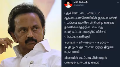 ஸ்டாலின் அவரது டுவிட்டர் பக்கத்தில் வெளியிட்டுள்ளதாவது: புதுக்கோட்டை மாவட்டம் ஆவுடையார்கோவிலில் முதலமைச்சர் எடப்பாடி பழனிசாமி திறந்து வைத்த நான்கே மாதத்தில் பாம்பாறு உயர்மட்டப் பாலத்தில் விரிசல் ஏற்பட்டிருக்கிறது! கமிஷன் - கலெக்ஷன் - கரப்ஷன் அ.தி.மு.க ஆட்சி என்பதற்கு இதுவே உதாரணம்! விரைவில் எடப்பாடியின் ஊழல் பாலமும் உடைந்து விழும்! என பதிவிட்டுள்ளார்.