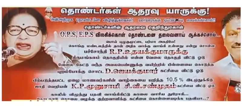 ‘பர்மா அகதியே பச்சோந்தி ஆர்.பி உதயகுமார், திருமங்கலம் தொகுதியில் என்ன வேலை கட்சியை விட்டு ஓடு எனவும், வேலை கேட்டு வந்த அவலப் பெண்ணுக்கு பிள்ளையை கொடுத்த புறம்போக்கு ஜெயக்குமாரே கட்சியை விட்டு ஓடு எனவும், காலில் விழுந்து ஆட்சி பிடித்து காலை வாரிய துரோகி பழனிசாமியே, கொடநாடு கொலை வழக்கு குற்றவாளிக்கு கட்சியை கொள்ளை அடிக்க பதவியா ?