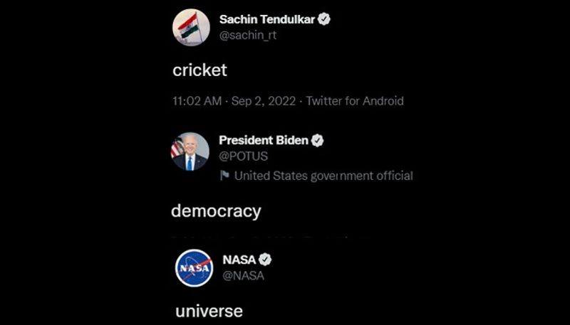 அமெரிக்க ஜனாதிபதி ஜோ பிடன் இன்று ட்விட்டரில் 'ஜனநாயகம்' இதனை ஆங்கிலத்தில் ‘democracy’ என்று பதிவிட்டார். உடனே நாசாவின் ட்விட்டர் பக்கத்தில் இருந்து, ‘universe’ என்று பதிவிட ட்விட்டரில் ஒரு வார்த்தை ட்வீட் வைரலானது. உலகின் பெரிய தலைவர்கள் முதல் பிரபலங்கள் வரை இந்த ஒரு வார்த்தை ட்வீட் போட்டு ட்விட்டரில் பட்டயை கிளப்பி வருகிறார்கள்.