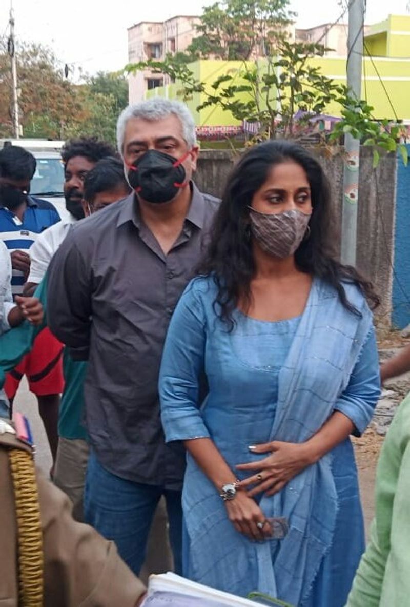 அரசியல் தலைவர்கள், சினிமா பிரபலங்களும் காலை 7 மணிக்கே வரிசையில் நின்று தங்களது வாக்குகளை செலுத்திவருகின்றனர். திருவான்மியூரில் உள்ள உள்ள சென்னை பெருநகர் தொடக்கப்பள்ளியில் தன்னுடைய மனைவி ஷாலினியுடன் வந்து வாக்களித்தார். காலை 7 மணிக்கு வாக்குப்பதிவு தொடங்கவிருந்த நிலையில் வழக்கம்போலவே அரை மணி நேரம் முன்பாகவே 6.30 மணிக்கே முதல் ஆளாக வாக்குச்சாவடிக்கு வந்தார் அஜித்.