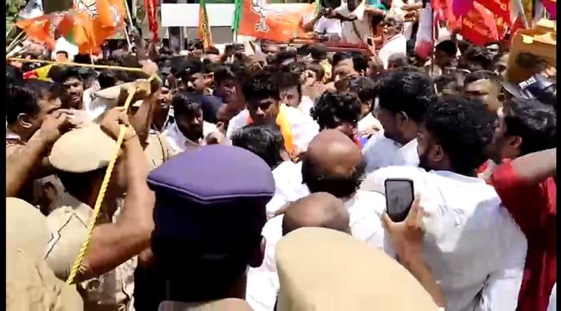 முன்னதாக கோவை பெரியகடை வீதியில் உள்ள கோனியம்மன் கோவிலில் சாமி தரிசனம் செய்தார். அப்போது அங்கு திருமணம் நடைபெற்ற புதுமண தம்பதிகளான கோவைப்புதூரை சேர்ந்த ரவி-தேவிகா தம்பதியினர் அண்ணாமலையின் காலில் விழுந்து ஆசி பெற்றனர். அப்போது வானதி சீனிவாசன் அர்ஜுன் சம்பத் சுதாகர் ரெட்டி உட்பட பாஜக நிர்வாகிகள் பலர் உடன் இருந்தனர். இந்தநிலையில் வேட்பு மனு தாக்கல் செய்யும் பகுதியில் இருந்து 200 மீட்டர் தொலைவில் உள்ள செஞ்சிலுவைச் சங்க கட்டிடம் அருகே பாஜகவினரை போலீசார் தடுத்து நிறுத்தினர். அப்போது பாஜகவினருக்கும் காவல்துறையினருக்கும் இடையே லேசான தள்ளுமுள்ளு ஏற்பட்டதால் பரபரப்பு நிலவியதால் சிறிது நேரம் பரபரப்பு ஏற்பட்டது.