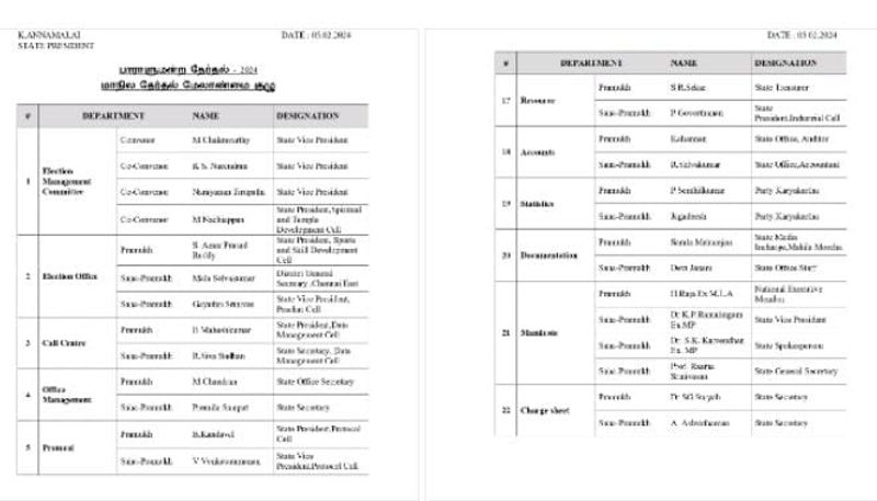 இதே போல பா.ஜ.க. தேர்தல் பிரச்சார உரை தயாரிக்க தனி குழுவும் உரையை அச்சிட தனி குழுவும் அமைக்கப்பட்டுள்ளது. மகளிர் பிரச்சாரக்குழு, இளைஞர் பிரச்சாரக்குழு, பட்டியல் இனத்தைச் சேர்ந்த பிரச்சாரக் குழு என 38 குழுக்களை அமைத்து அண்ணாமலை அறிவிப்பு வெளியிட்டுள்ளார்.