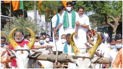 கர்நாடகாவை கண்டித்து தஞ்சாவூரில் நடைபெறும் உண்ணாவிரததிற்கு பாஜக மாநில தலைவர் அண்ணாமலை மாட்டு வண்டியில் வந்தார்.