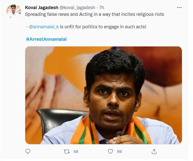 அதற்கு ஏற்றாற்போல் #ArrestAnnamalai என்ற ஹேஷ்டேக் தற்போது படு டிரெண்டிங் ஆகி வருகிறது. இந்த ஹேஷ்டேக்கை பலரும் டிரெண்டிங் ஆக்கி வருவதோடு, பாஜகவையும், அதன் தமிழக தலைவர் அண்ணாமலையையும் போட்டு வறுத்தெடுத்து வருகின்றனர். பிரச்னையை திசை திருப்பிய அண்ணாமலை மீது தமிழக முதல்வர் உடனடியாக நடவடிக்கை எடுக்க வேண்டும், தமிழகத்தின் அமைதியை கெடுத்து, மத பிரச்னையை ஏற்படுத்த நினைக்கிறார் அண்ணாமலை என்று ஆளாளுக்கு டுவிட்டரில் போட்டு தாக்கி வருகின்றனர்.
