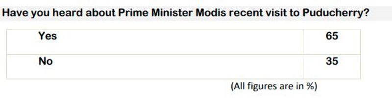 பிரதமர் மோடி கடந்த மாதம் புதுச்சேரி சென்று, பல்வேறு நலத்திட்டங்களை தொடங்கிவைத்ததுடன், முடிவடைந்த திட்டங்களை திறந்தும்வைத்தார். பிரதமர் மோடியின் அந்த வருகை குறித்து கேள்விப்பட்டீர்களா என்ற கேள்விக்கு 65% பேர் ஆம் என்றும் 35% பேர் இல்லை என்றும் தெரிவித்தனர்.